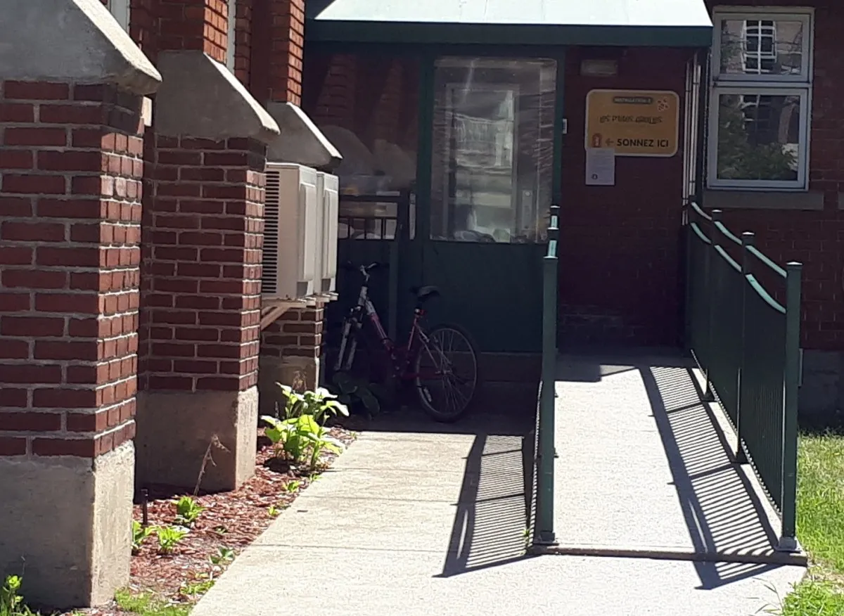 Une rampe d'accès est disponible depuis le jardin intérieur pour accéder au bâtiment.