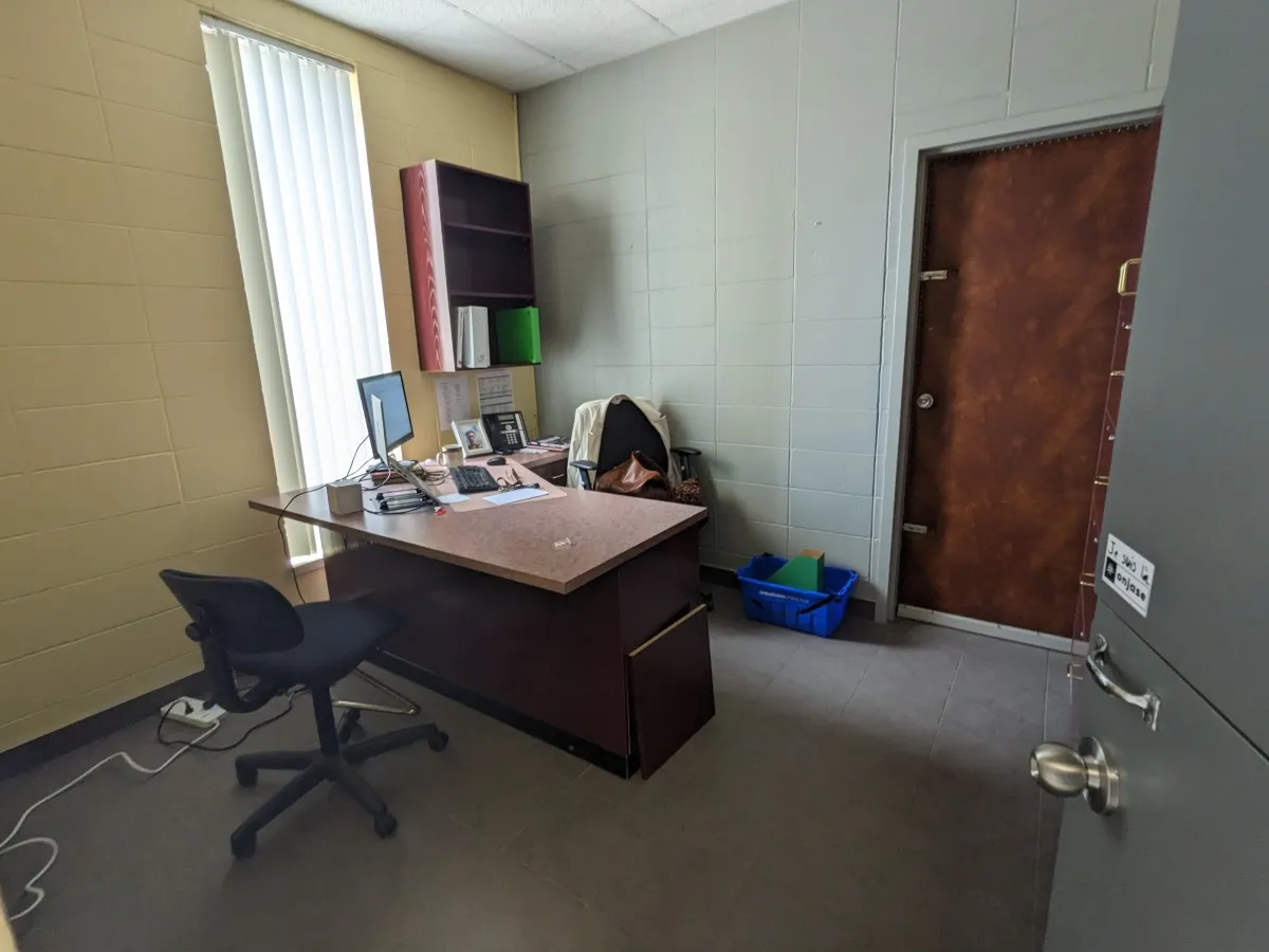 - La porte à côté du stationnement : accessible, ouverture manuelle. Il y a aussi une petite rampe à faible pente en bas de la porte.