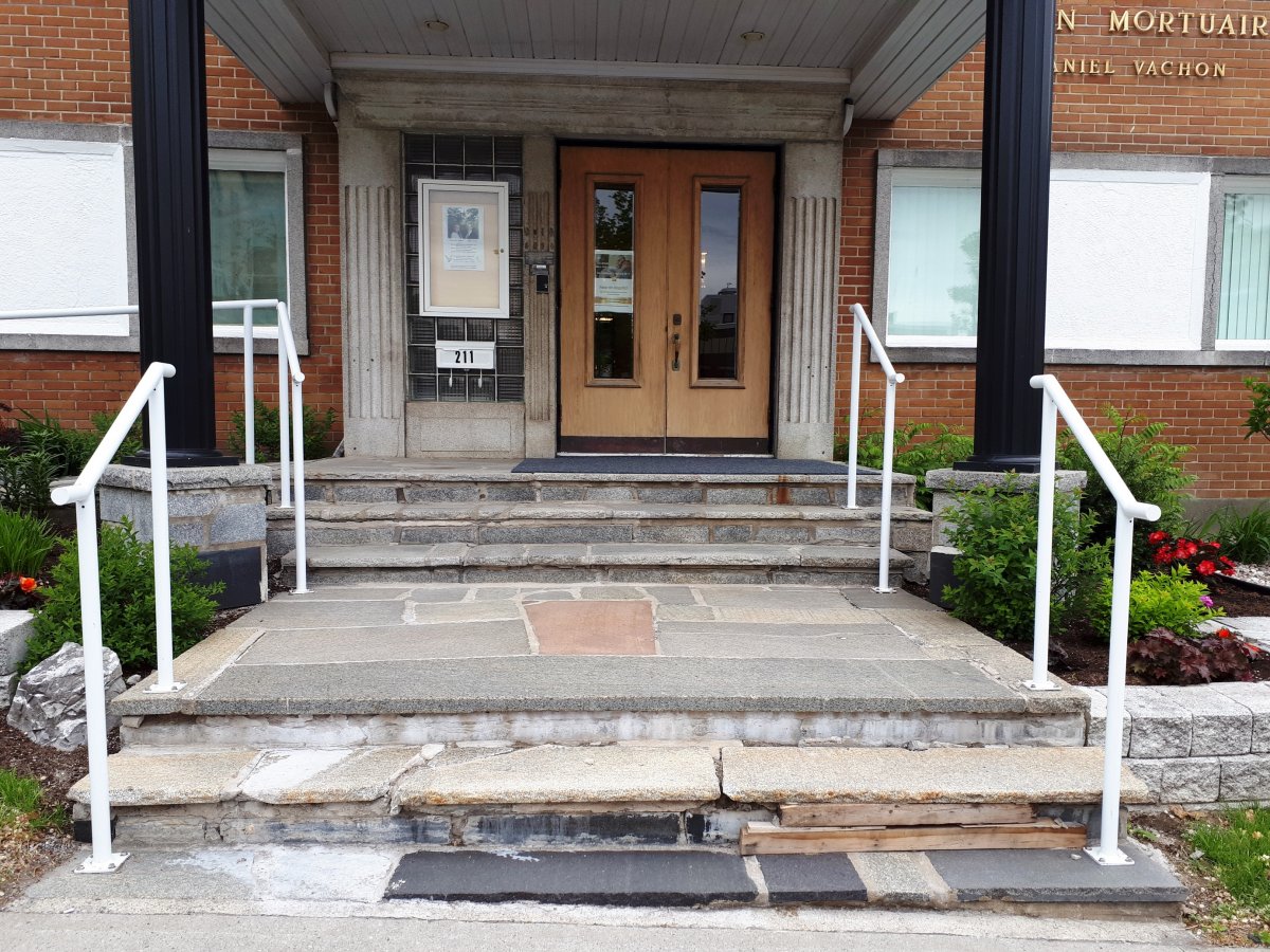 Le stationnement du centre funeraire n'a pas de places réservées. L'option pour les personnes handicapées est dans le stationnement public P5 de la Ville à côté de l'Église St-Frédéric. Deux places réservées à 5 minutes de marche. (Voir le plan ici-bas)